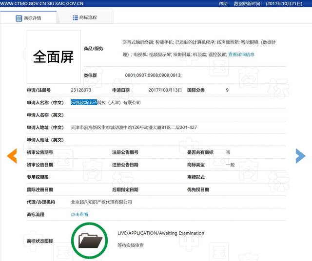 在今年的手机市场上,特别是下半年,全面屏无疑是其中最大的一个热点,三星、小米、苹果、vivo、华为等手机厂商都纷纷推出了旗下的全面屏手机。而其中,国内大部分手机厂商,都直接把“全面屏”作为自己手机宣传的一个亮点。苹果、小米、三星、华为、金立,你方唱罢我登场,每家厂商都说自己是真正的全面屏,粉丝也为此吵得不可开交。在所有知名手机企业都在转战全面屏市场时,到底谁最先申请注册“全面屏”商标?就这个问题同辉查询了下发现这枚商标是乐视控股的一家天津企业申请注册的,目前正在受理中。