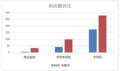 分析判决的结果,充分体现出这类诉讼的特点——原告举证难,对于专利申请权和专利权权属纠纷,原告证明被告申请的专利技术构成职务发明难。而对于侵犯商业秘密,除原告要证明被告利用了企业的相关信息外,还要证明该信息构成了原告的商业秘密。在撤诉案件中,撤诉原因一部分可能是原、被告达成了和解,也可能是因为原告自己认识到证据欠缺没有胜算主动撤诉,还有可能是法院法官认为原告难以胜诉,为了节省审判资源劝说原告撤诉,估算和解比例不会超过50%。